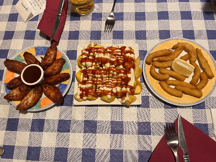 숙소에 돌아와 내일 떠날 수 있도록 짐정리를 해놓고 저녁식사를 하러 나갔습니다.  부슬부슬 내리는 빗방울을 피해 숙소에서 가장 가까운 바(Bar)로 가서 저녁식사를 합니다.  치킨윙과 감자 그리고 점심때 맛이 좋았던 깔라마리 튀김이 생각나서 음식을 주문하고 와인과 함께 맛있게 먹으며 하루를 마무리 합니다.