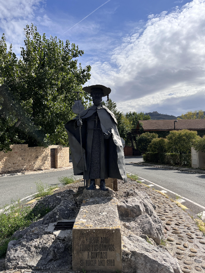 무루사발 마을이 나왔다는 것은 오늘의 목적지인 푸엔테 라 레이나가 얼마 남지 않았다는 뜻입니다.  힘을 내어 걸어갑니다.  약 1시간 조금 더 걸어가 푸엔테 라 레이나에 도착합니다.  마을 입구에 순례자를 형상화한 철제 조각물이 저희를 반갑게 맞아줍니다.  화창한 날씨에 저희와 패밀리들 저마다 기념사진을 찍은 후 마을로 들어갑니다.
