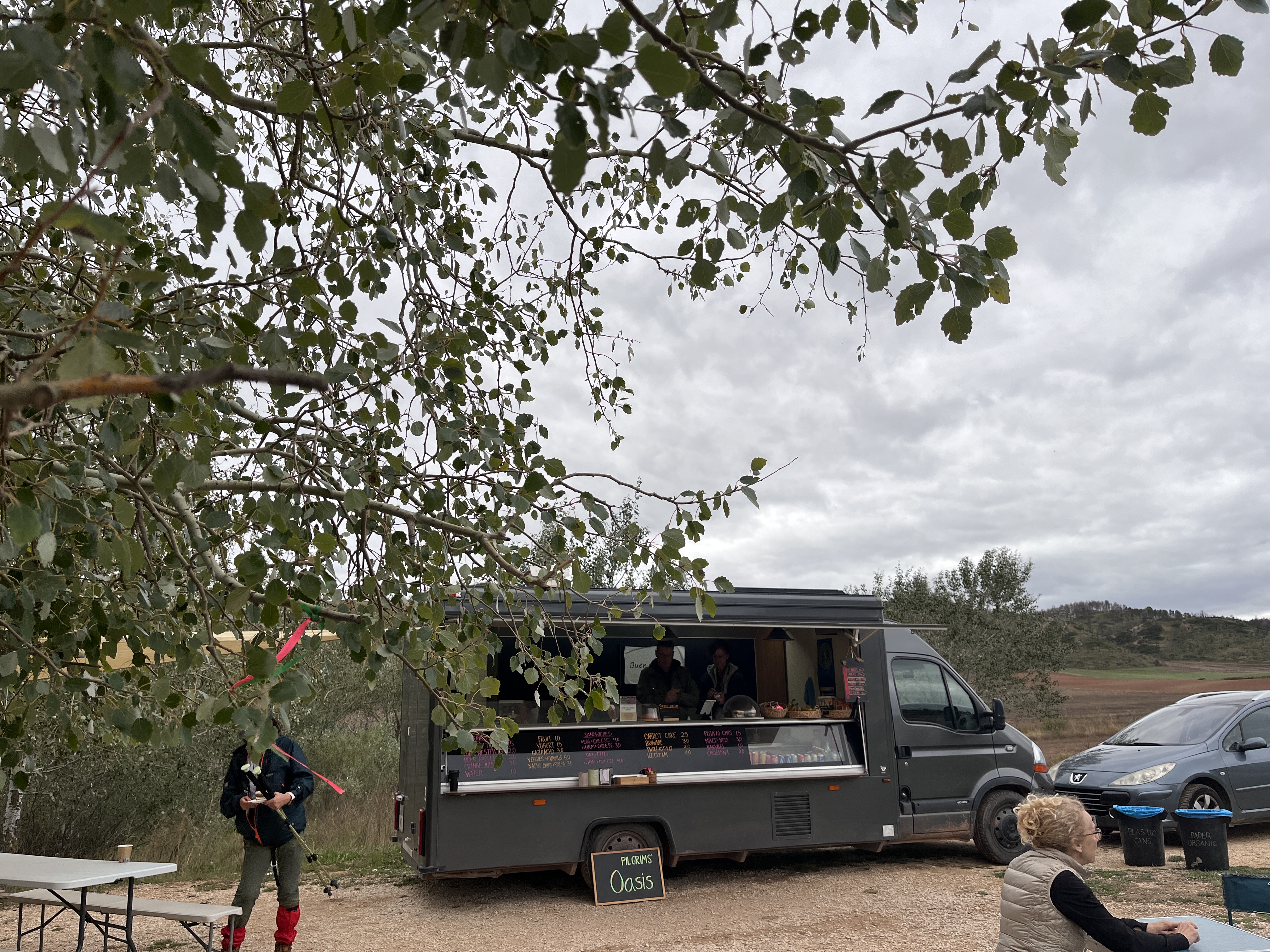 약 1~2시간을 더 걸어가다 보니 날씨는 점점 쌀쌀해지는 듯하고 체력은 점점 더 떨어져 허기가 찾아오기 시작합니다. 무엇보다 걸어도 체온이 많이 떨어져서 비옷을 계속 입고 걸었습니다. 그런데 정말 사막의 오아시스처럼, 순례자들에게 오아시스와 같은 Food Truck이 나타났습니다. 푸드트럭의 이름도 'Pilgrim's Oasis(순례자의 오아시스)'입니다.